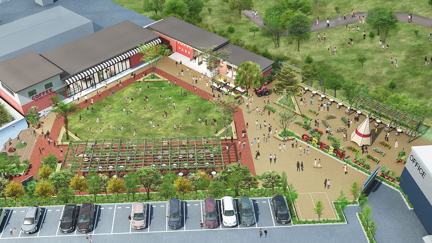 遊休化した敷地を、緑豊かな広場を中心としたオフィス・カフェ・ショップへ