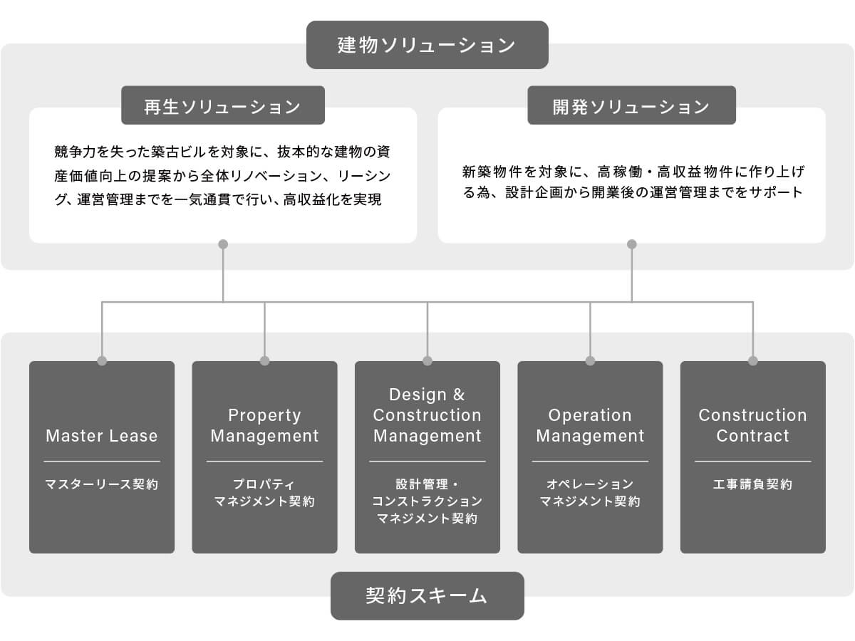 マーケティング、資産価値向上、事業計画立案、スキーム提案、企画・デザイン、コンストラクションマネジメント業務、プロモーション等を行い、テナントの募集や条件交渉、契約業務を代行し、ビルの稼働率と価値を上げます。