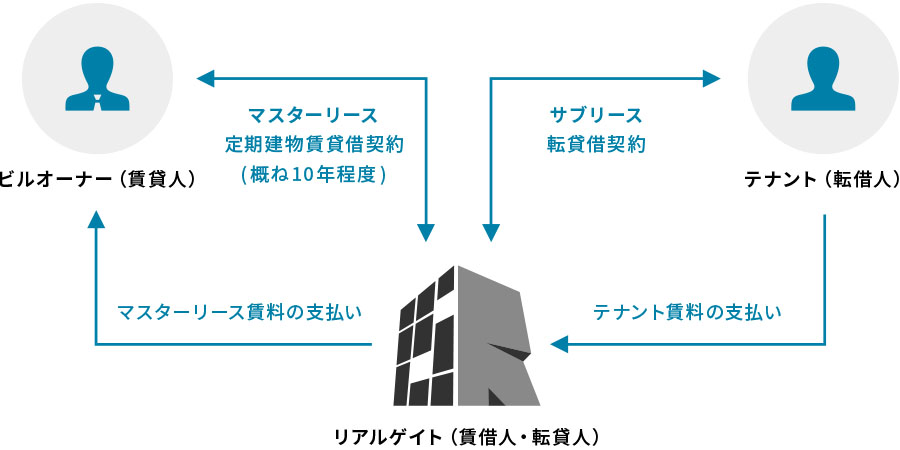 オーナー様がお困りの物件を、リアルゲイトが一定期間(約10年程度)一括借上げをし、定額賃料をお支払い。オーナー様は契約期間内の安定収入を約束されます。