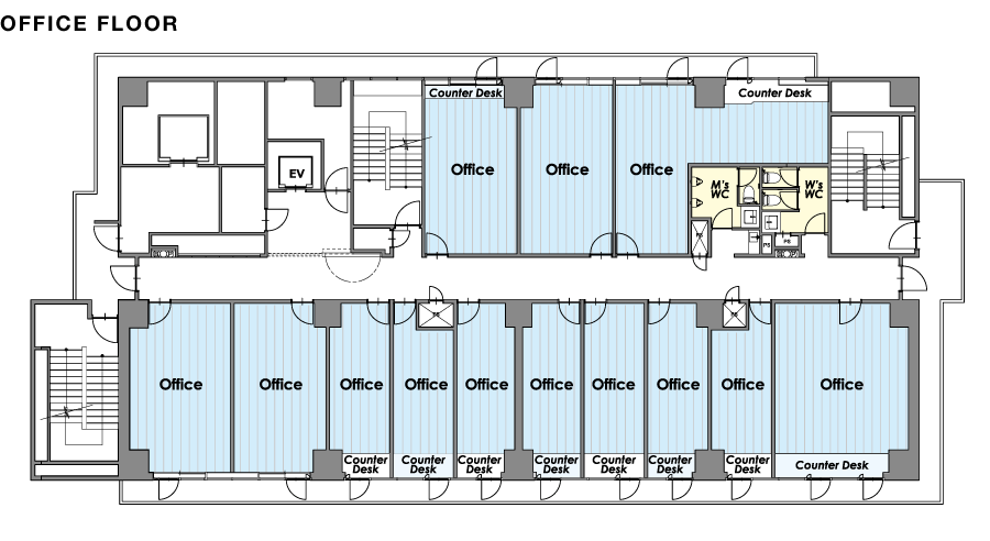 このタイプのオフィスを計画する上で、最も重要なポイントのひとつがトイレの位置になります。完全個室のスモールオフィスとなるため、専有部にトイレがあるのを好まない入居者が多く、特に女性が在籍する場合は、オフィスを選ぶ条件として挙げる企業も少なくありません。そこで、専有部の水回りはすべて撤去し、各階に共用トイレを設置。築古ビルのオフィスへのリノベーションにおいて、水回りを残すとなると工事費もかさむため、完全撤去は一石二鳥になります。