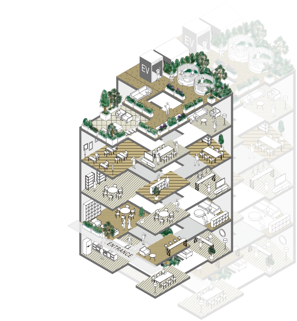 その特性を活かし、「働く」だけではなく、寛ぎと安心感を与えるような、街と人と空気が心地よく響き合う空間を提供します。エントランスホールのシンボルツリーや、洗練されたデザインのルーフトップなど、開放的な共用部に配置されたグリーンが、まるで自然の中を散策しているような空間となり、集まる人とのコミュニケーションを促します。また、天井の高さを重視した専有部と合わせて、開放感溢れる気持ちの良い施設を実現しました。