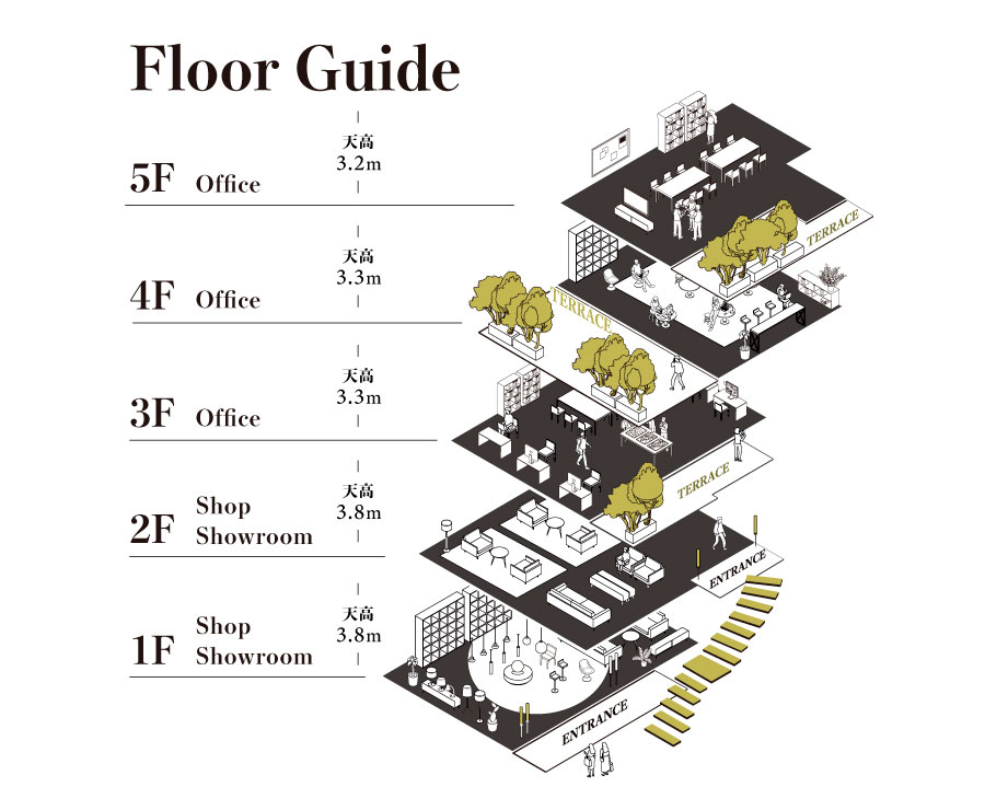 当施設は表参道駅徒歩7分、地上5階建の新築ビル。1階と2階は天高約3.8m、アパレルや家具メーカーなどのショップやショールーム、サービス店舗や飲食店舗として、3~5階は117.60㎡~169.41㎡のオフィススペースとしてご利用いただけます。