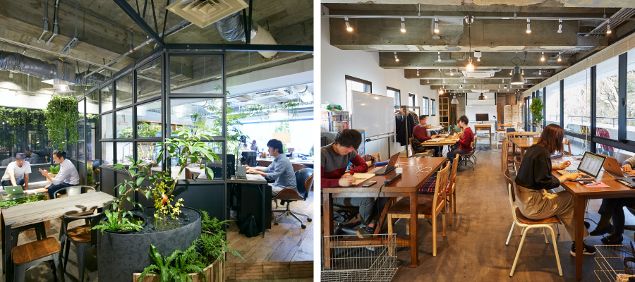 ▲(左)グリーンをふんだんに取り入れ、独創的な空間を実現(右)オーダーメイドオフィスを利用した入居事例