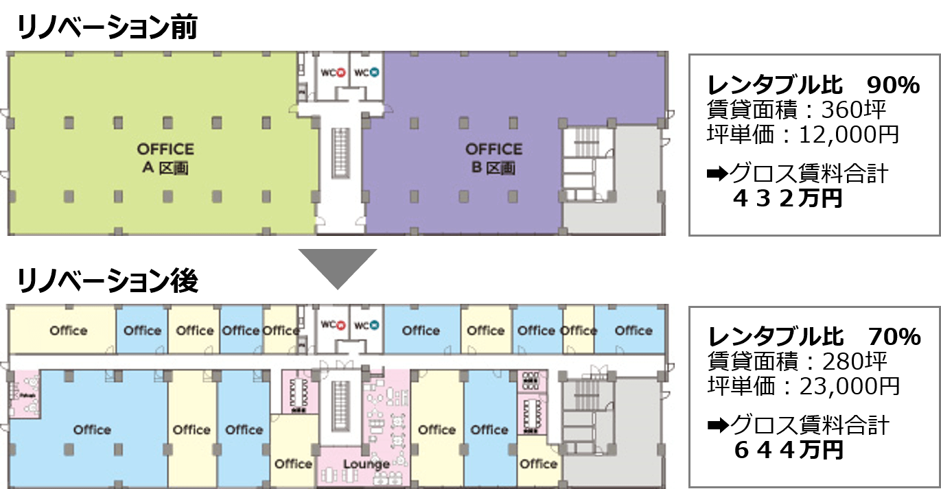 廊下やラウンジ、会議室等の共用部を設けたことでレンタブル比は約20%下がるものの、専有部の坪単価は1万円以上アップし、グロス賃料は約33%増加しました。