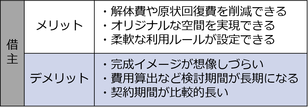 一方デメリットは、完成イメージの想像がしづらい、工事費などの費用算出が難しく、入居検討に要する期間が長期になる、契約期間が比較的長い点などです。