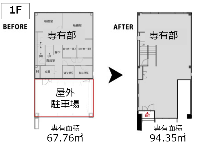 リノベーションのポイントは、増築と用途変更です。容積率に余裕があった為、1階の屋外駐車場を区画形成することで、約27㎡増床させました。