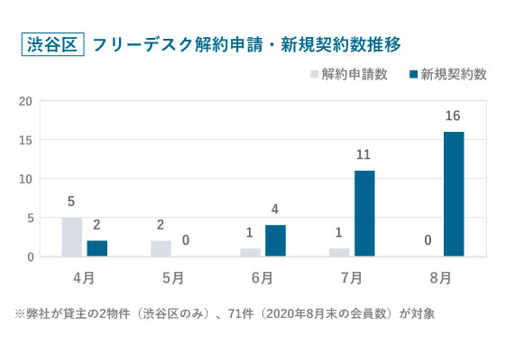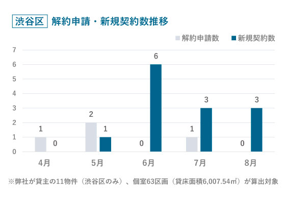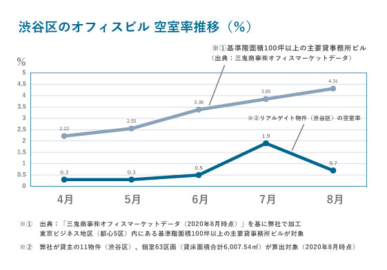弊社では、都内で約45棟(渋谷区で11棟)、700区画(平均貸付面積67.94㎡)のスモールオフィスを供給していますが、渋谷区の物件の空室率(面積ベース/弊社が貸主の物件)は、コロナ禍でも急上昇することなく、0.3%~1.9%を推移しており、直近の8月は空室率0.7%となっています。(図1参照)縮小移転やコストダウンを兼ねて移転する企業や個人が多く、一部の会社では拡大移転の需要もあります。