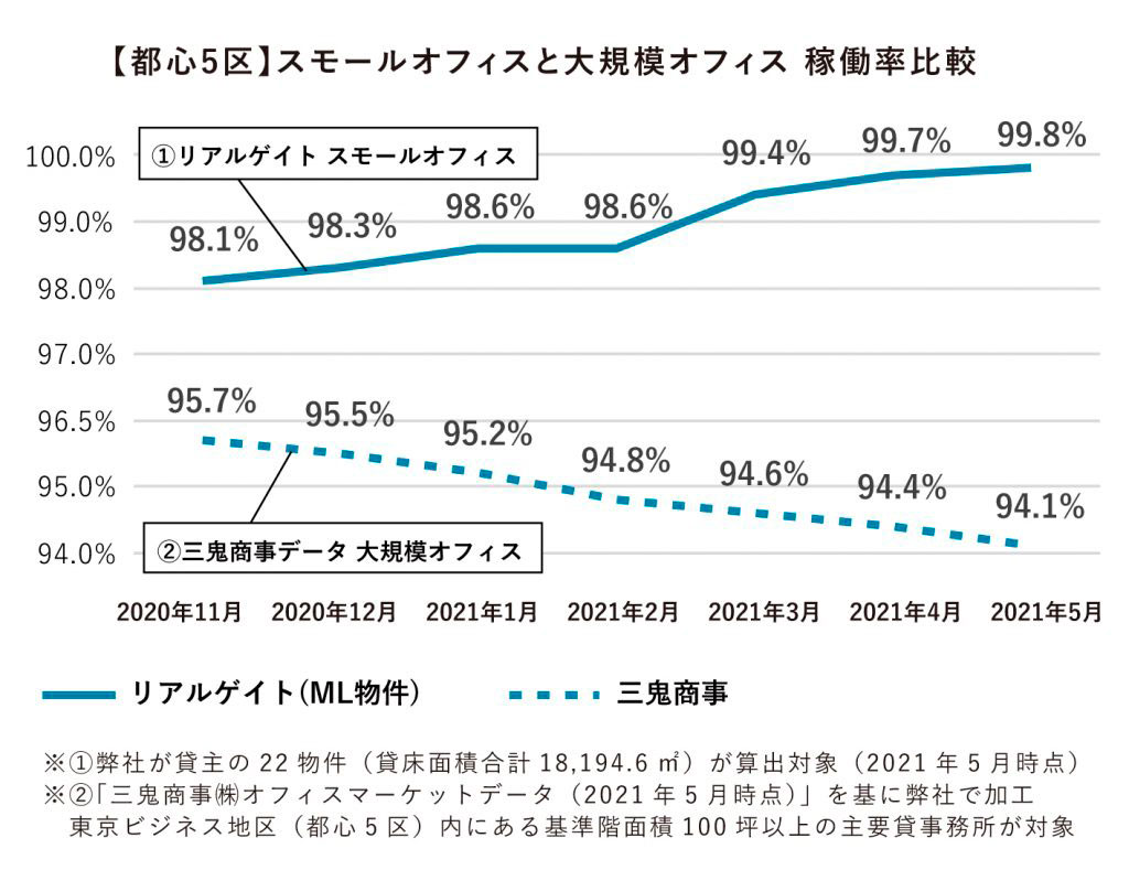 弊社がマスターリース(ML)を行う都心5区、10坪前後のスモールオフィス稼働率は、2021年5月時点で99.8%とほぼ満室で稼働しています。
