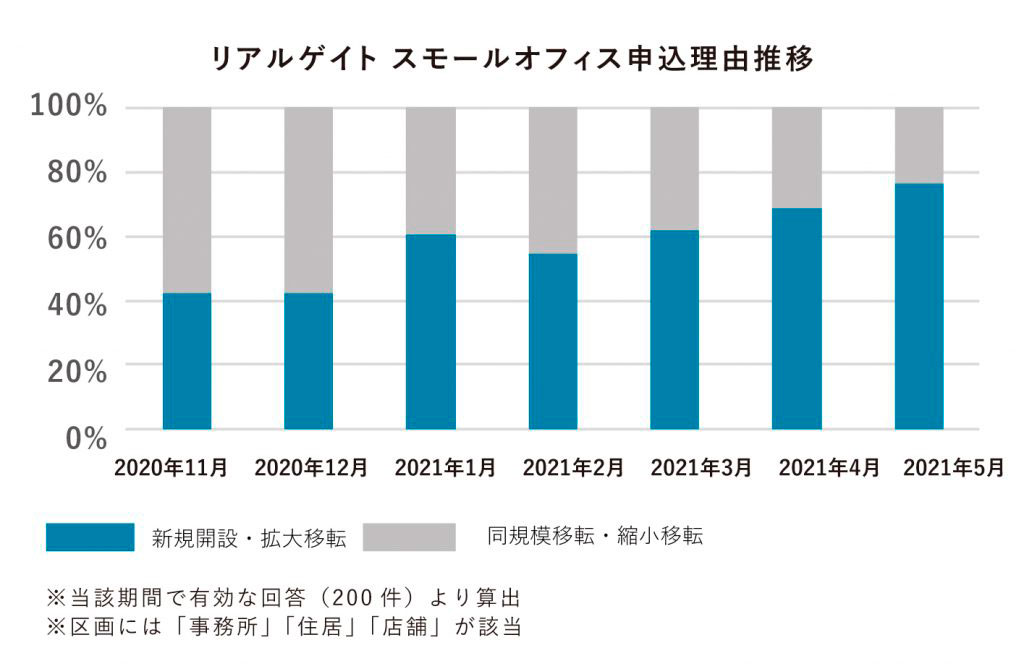 スモールオフィス契約時の理由によると、昨年末までは縮小移転・同規模移転の傾向が半数以上を占めていたのに対し、今年に入ってからは拡大移転・新規開設の傾向が強まり、直近の5月では70.6%の契約理由が拡大移転となっています。(図2参照)