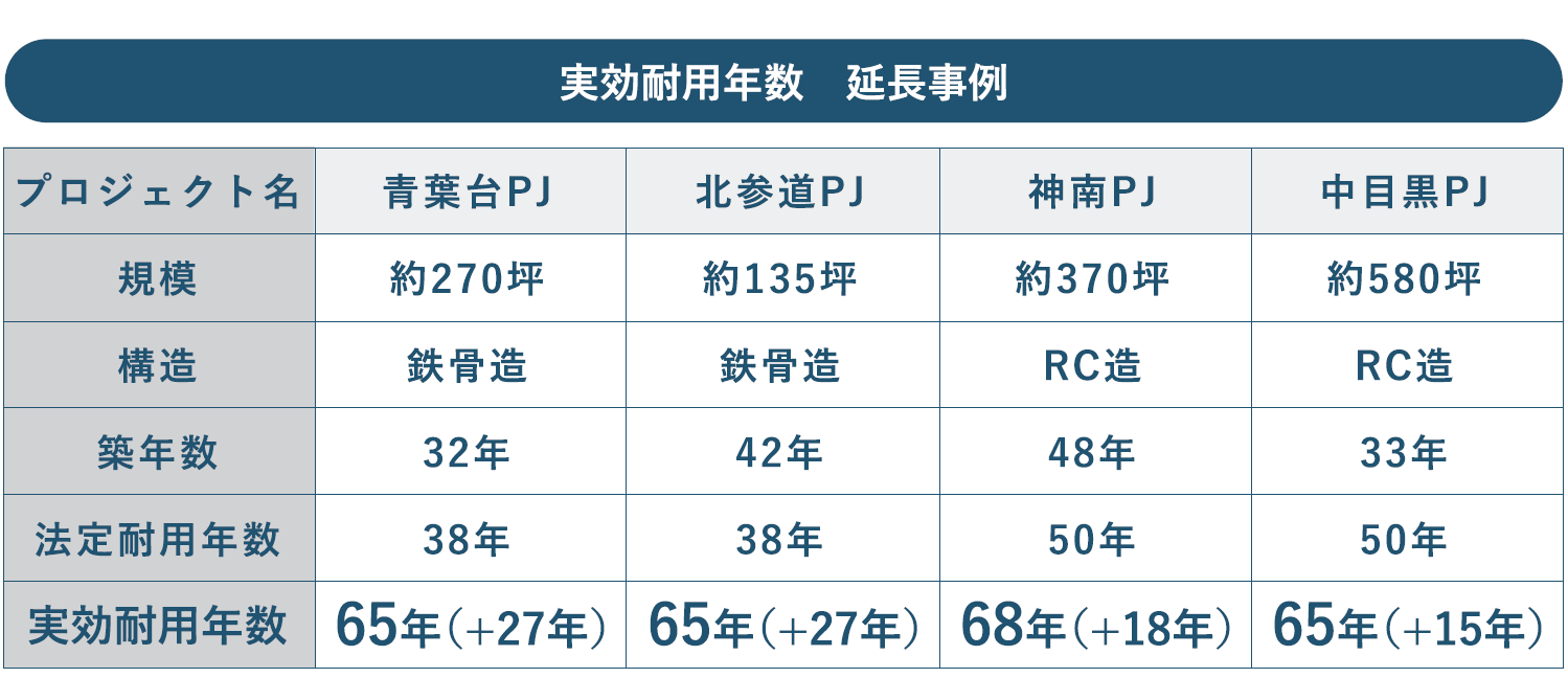 当社の直近の事例では、建物の平均寿命が約21年延びた実績があります。(表1)
