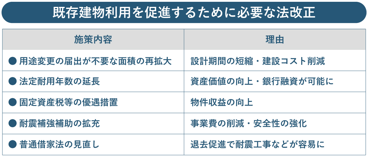今後さらに既存建物の活用を推進するには、用途変更の届出が不要な面積の更なる拡大、法定耐用年数の延長、固定資産税等の優遇措置、耐震補強補助の拡充、普通借家法の見直しなどの施策が求められます。(表1)