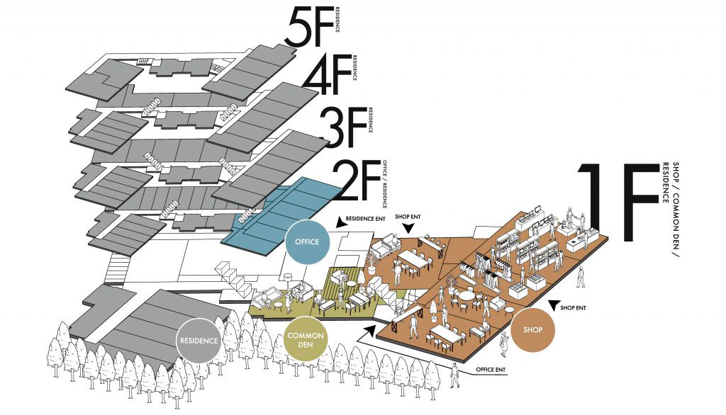 当プロジェクトは、丸仁ホールディングスが事業主となり、プロジェクト推進及び賃貸レジデンスの運営管理を東急住宅リースが手掛け、施設全体のコンセプトメイキング及び共用書斎「COMMON DEN」のデザイン監修、オフィス・ショップ区画の運営管理をリアルゲイトが担います。