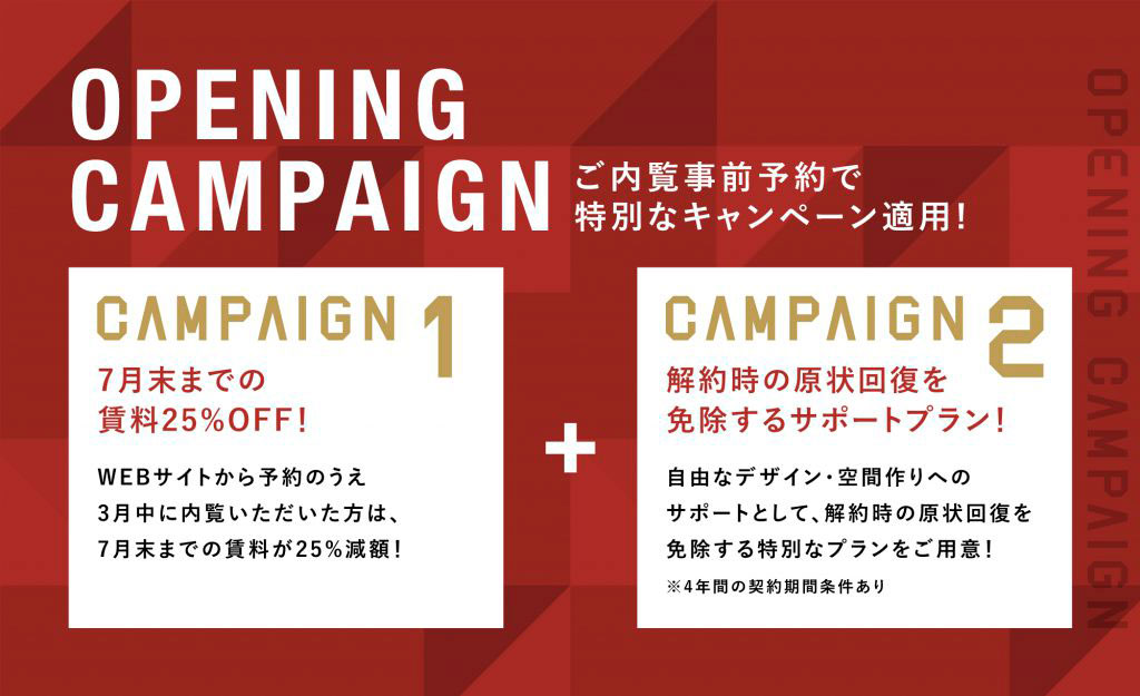 3月末日までにWEBサイトから内覧予約をいただいた方限定で、7月末まで賃料25%OFF、解約時の原状回復を免除するキャンペーンを実施中です。