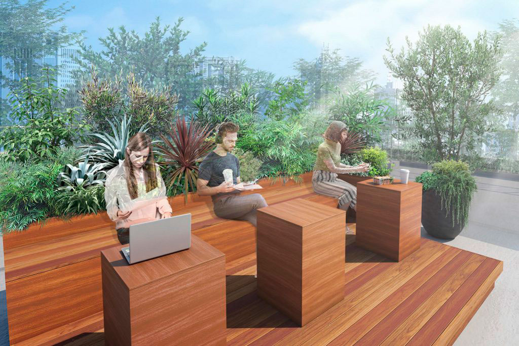 オープンエアーな植栽に囲まれた共有スペースで、仕事合間のリフレッシュやランチスペースとしてはもちろん、Wi-Fi完備でWEB作業にも対応。リラックスできる空間を設けることで、新しいアイデアやコミュニケーション創出に寄与します。