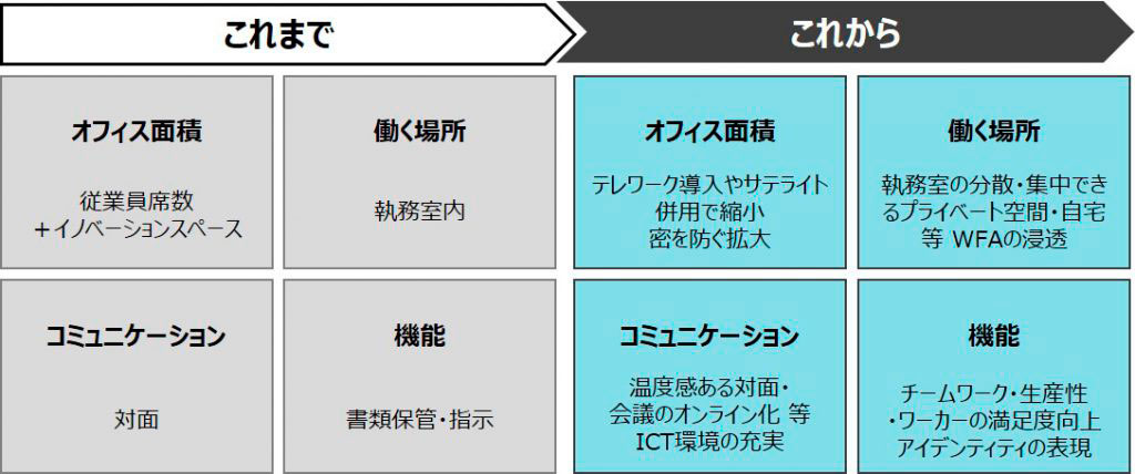 今回のコロナ禍では、働く場所や時間を選ばない「Work From Anywhere(WFA)」の浸透や、新たなサテライトオフィスニーズが生まれるなど、働き方の多様化が加速しています。また今回の経験により、テレワークが可能であること、逆にテレワークでは行えない業務があることも顕在化しました。