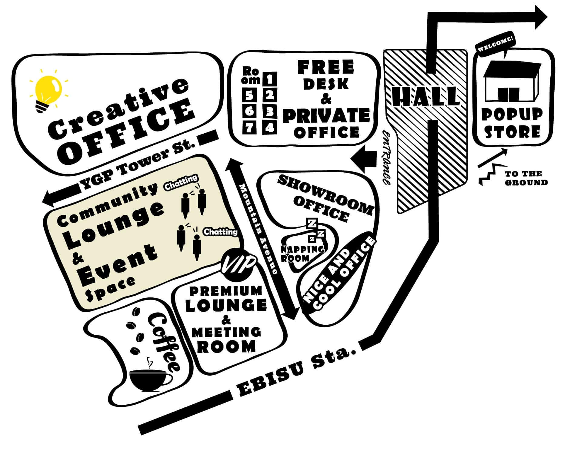 仮眠室を併設したシェアオフィスを中心に、地域住民や来街者も利用できるカフェ、イベントスペース、ポップアップストアで構成され、施設内ラウンジのクリエイティブディレクションは、株式会社トランジットジェネラルオフィスが手掛け、スタートアップやクリエイターに支持される施設へ刷新します。「生活」と「ビジネス」圏とが近い、恵比寿ならではの魅力を活かし、形にとらわれない新しいワークスタイルを提供するとともに、恵比寿エリアの更なる地域活性化と、新たなコミュニティ創出を実現します。