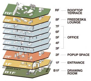 1フロア1テナントの独立性が高いワンフロアタイプのオフィス。区画済みの小部屋、水栓シンク、防音室、シャワーブース、フォンブースなど各階毎に異なる設備をご用意。
