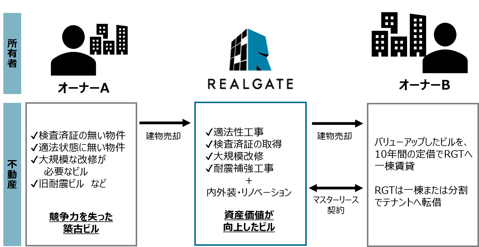 2019年4月より当社が開始したビルの1棟貸しサービスで、経年劣化により不動産価値が下がるなど競争力を失った、300坪未満の築古小規模ビルをリアルゲイトが一括で借り上げ、一定の工事を行った後、スタートアップ企業向けに再賃貸する事業。