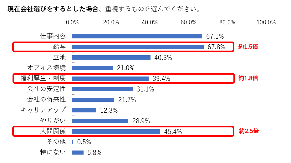 1)初就職では「仕事内容」を最も重視するも、その後の就職では「人間関係(2.5倍)」「福利厚生・制度(1.8倍)」「給与(1.5倍)」が急上昇