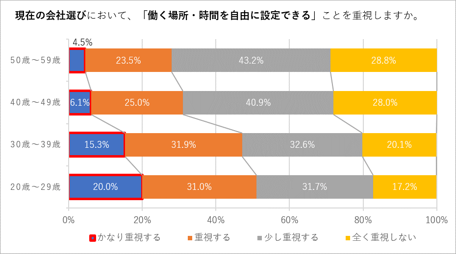 現在の会社選びにおいては、「働く場所・時間を自由に設定できる」ことを「かなり重視する」と回答する20代・30代が約20%いる一方、40代・50代の「かなり重視する」は5%前後と少ない。