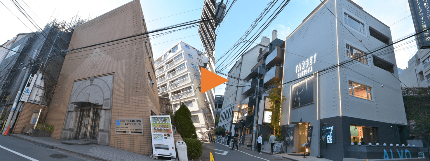 ▲一棟貸しの「OMB JINGUMAE」の外観 工事前とテナントによる工事後