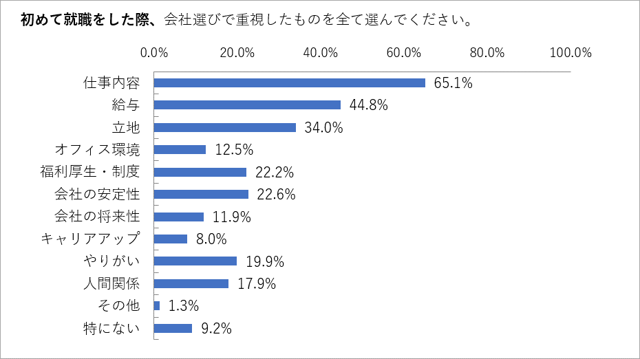 初就職では「仕事内容」を最も重視、その後は「人間関係」「福利厚生・制度」「給与」が急上昇