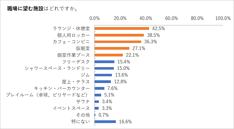 職場に求める設備上位には「ラウンジ・休憩室」「カフェ・コンビニ」「仮眠室」と