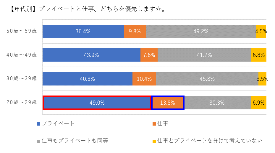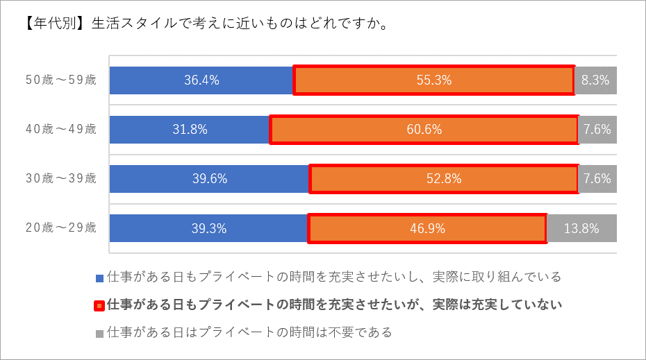 プライベートと仕事の優先度を聞いたところ、20代の半数(49.0%)が「プライベートを優先」と回答するも、一方、「仕事を優先」すると回答した20代も全世代の中で最多の13.8%だった。また実際の生活スタイルは、全体の半数以上が「仕事がある日もプライベートの時間を充実させたいが、実際は充実していない」と回答。
