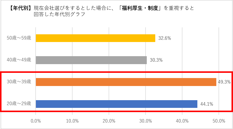 特に20~30代の若者は、他の世代に比べ「福利厚生・制度」の回答が多く、働く環境を重視。