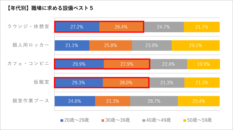 中でも20・30代の3割が「ラウンジ・休憩室」「カフェ・コンビニ」「仮眠室」などのリフレッシュ空間を希望。