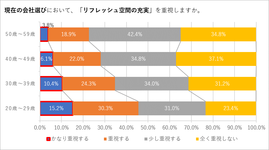 「かなり重視する」人は、20代が15.2%、30代が10.4%、40代が6.1%、50代が3.8%と、若い世代ほどリフレッシュ空間へのこだわりが強い傾向がある。