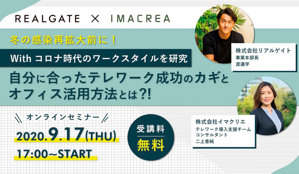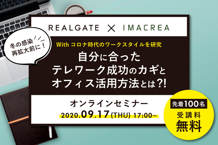 リアルゲイトとイマクリエは、テレワークを成功に導くための術やオフィス環境をテーマとしたオンラインセミナーを共催します。