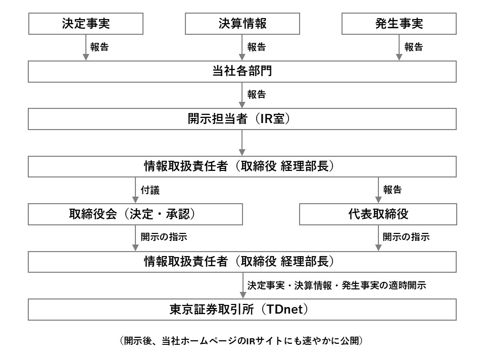 適時開示につきましては、東京証券取引所の適時開示情報伝達システム(TDnet)を通じて開示するとともに、その後速やかに当社ホームページにも掲載しております。適時開示規則に該当しない情報につきましても、当社ホームページへの掲載等により広く開示いたします。また、情報の正確性及び開示の公平性の観点から、IR担当役員をスポークスパーソンとしております。